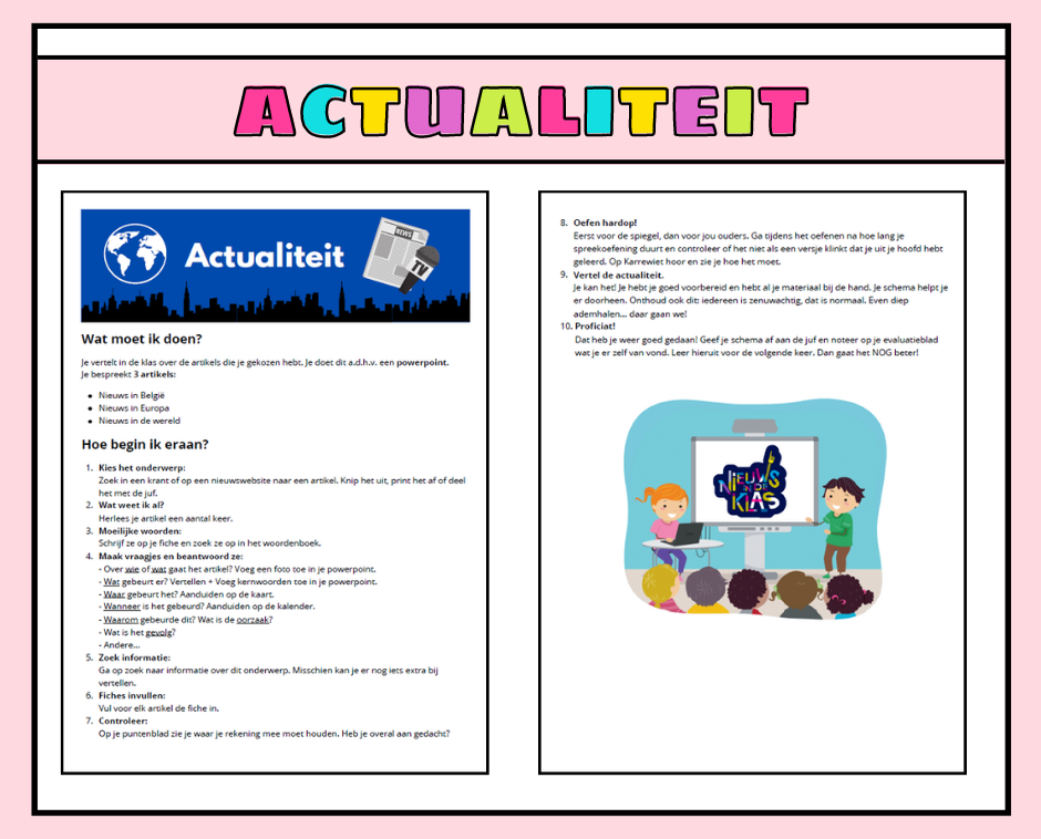 Stappenplan en fiches (ook digitaal in te vullen) om actualiteit voor te bereiden + sjabloon powerpoint + evaluatiedocument voor de leerkracht + zelfevaluatiedocument voor de leerling.